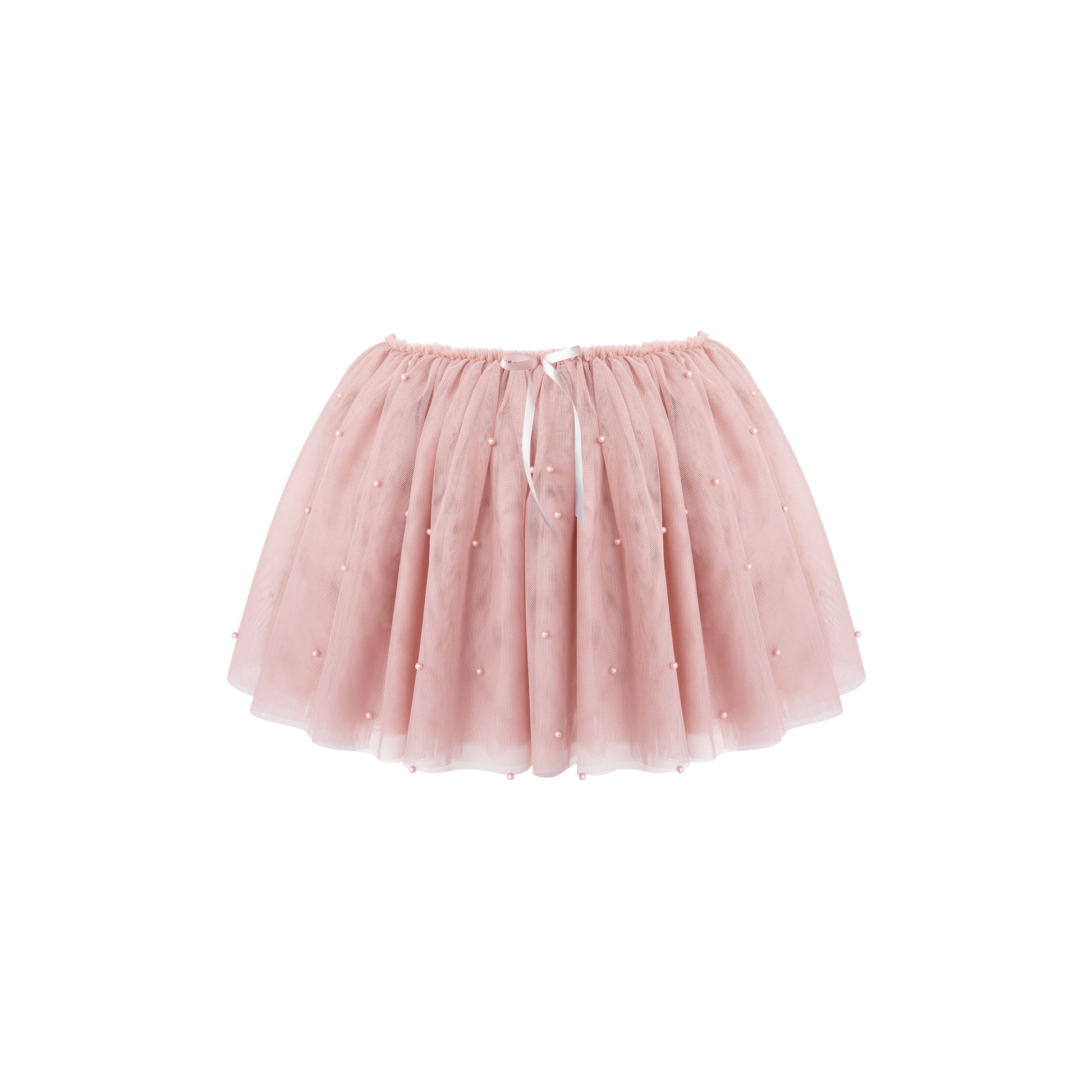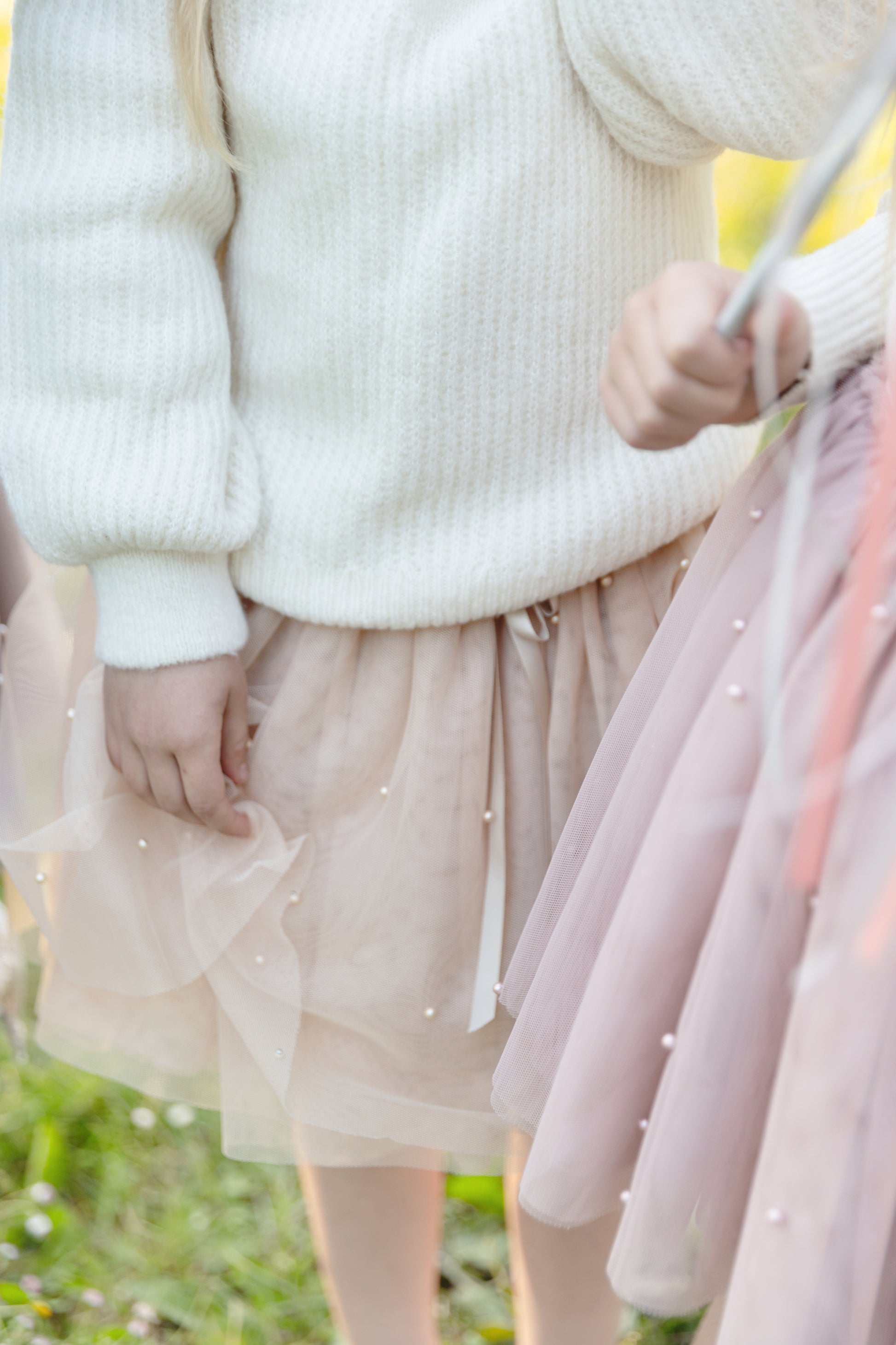 This stylish and fluffy tulle skirt "Audrey" with beautiful pearls on the top layer of the skirt, which glitter perfectly in the sun, is the perfect choice for all the little princesses among us.