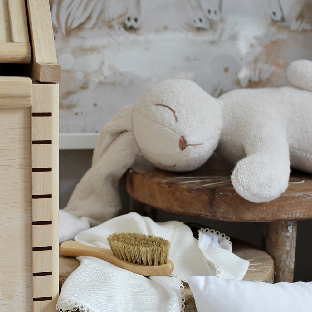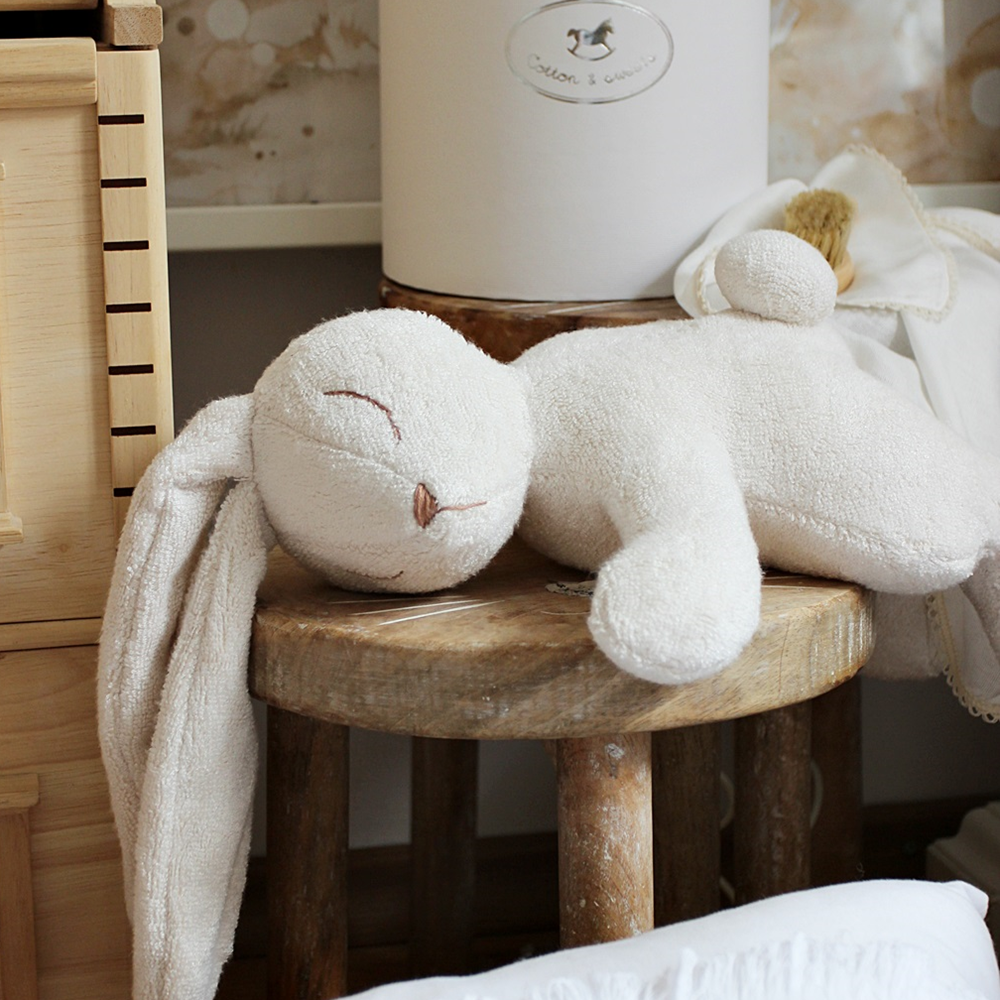 The rabbit's sleeping eyes and mouth are sewn on, so the cuddly toy does not contain any elements that could potentially pose a threat to your child.
