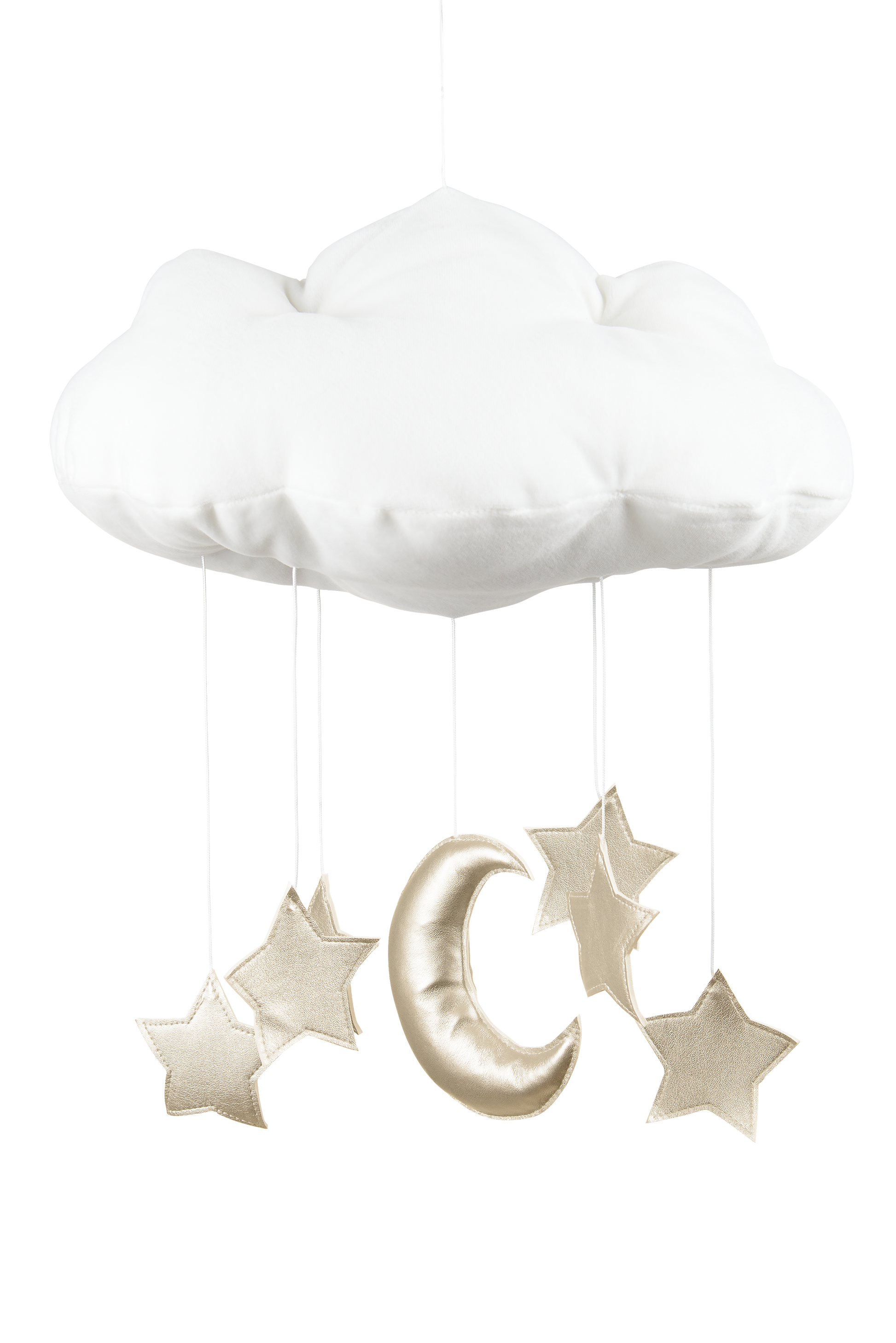 Sparkling gold stars hang from the soft and puffy white cloud, giving the mobile a magical look to the interior.