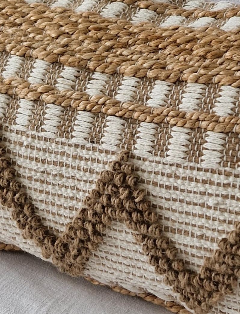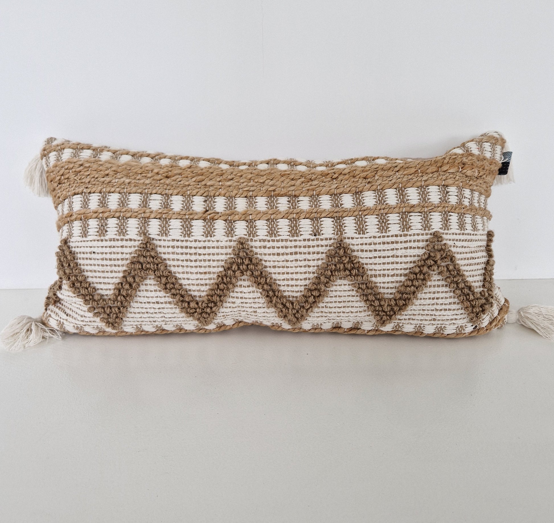 Very beautiful and decorative elongated Jute cushion in Off-white / Natural colors with tassels.