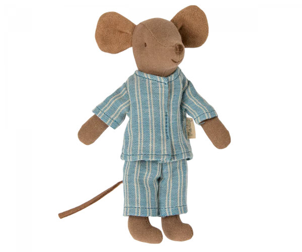 Brown mouse with blue striped pajama suit