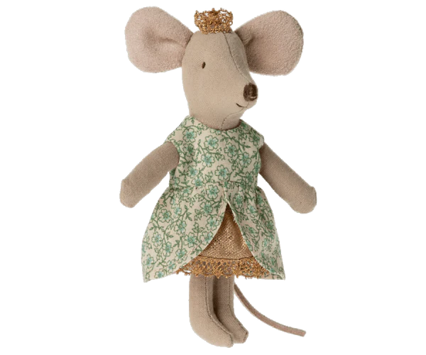This cute princess mouse wears a gold crown and a glittery dress with a floral pinafore. The dress is tied at the back with a beautiful lace bow.