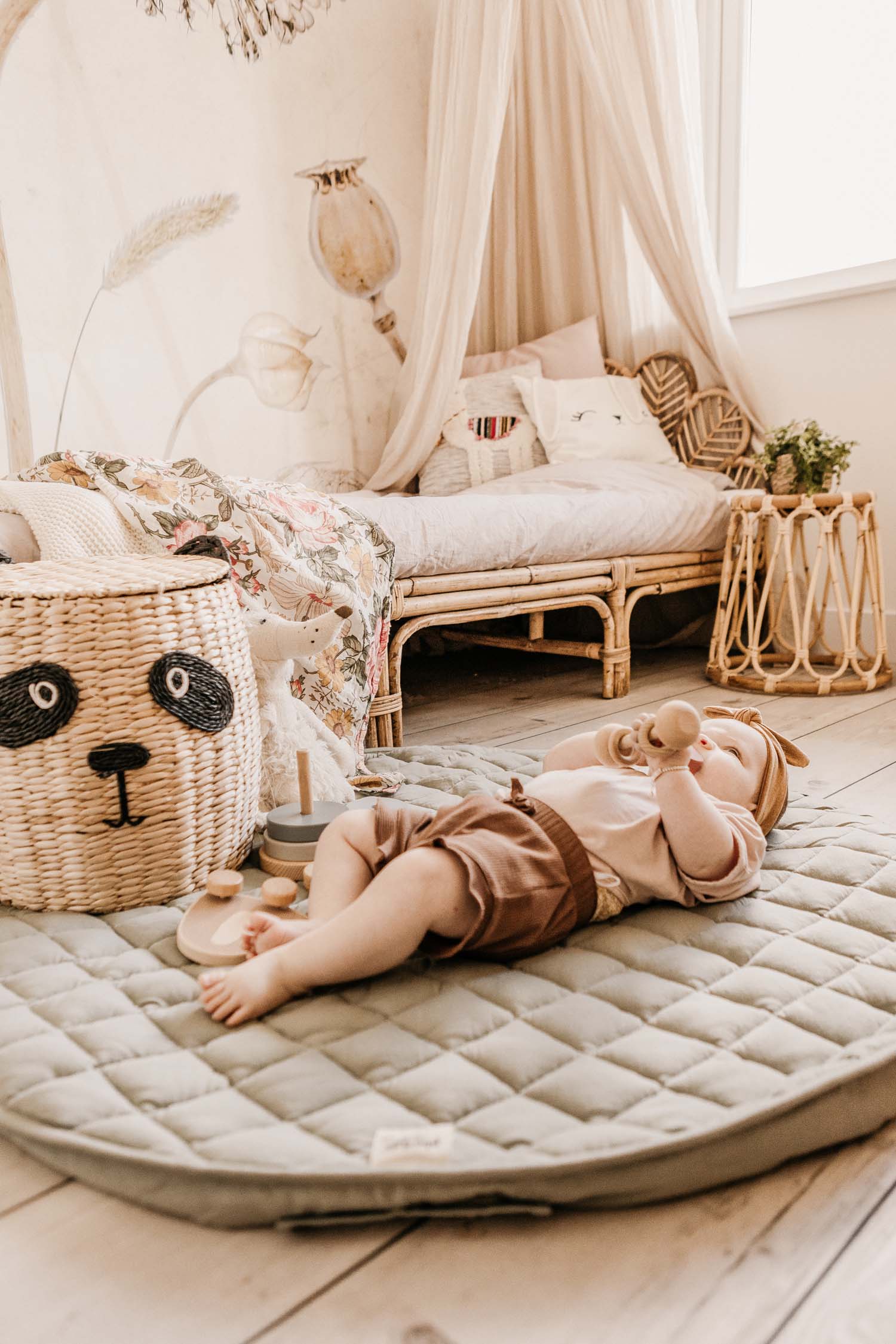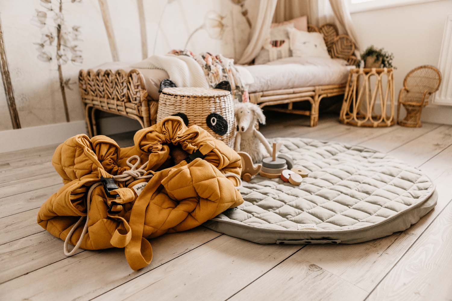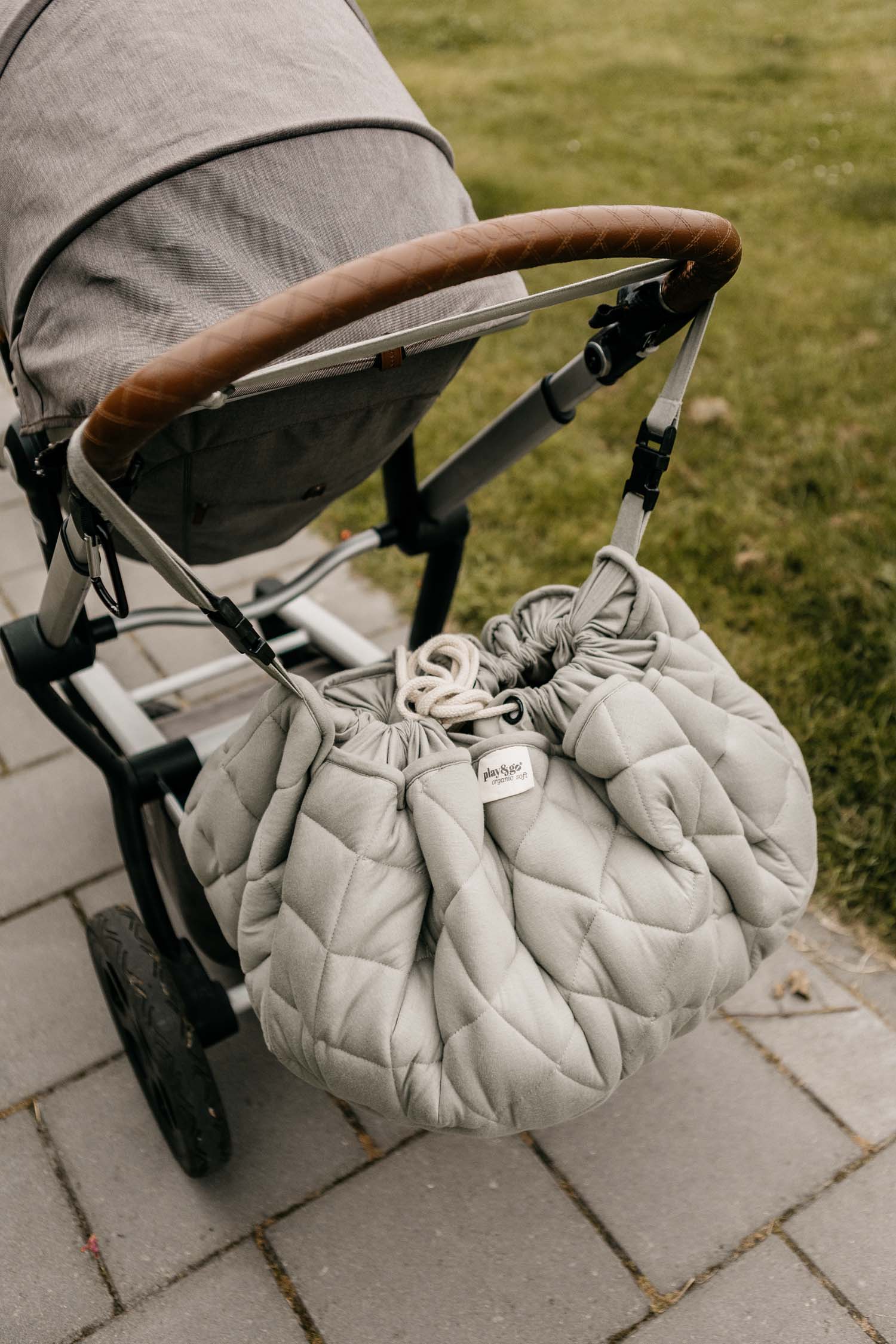 Discover this beautiful organic unique padded baby play mat which is at the same time storage toy bag, diaper bag as well from the Belgian brand Play&Go.
