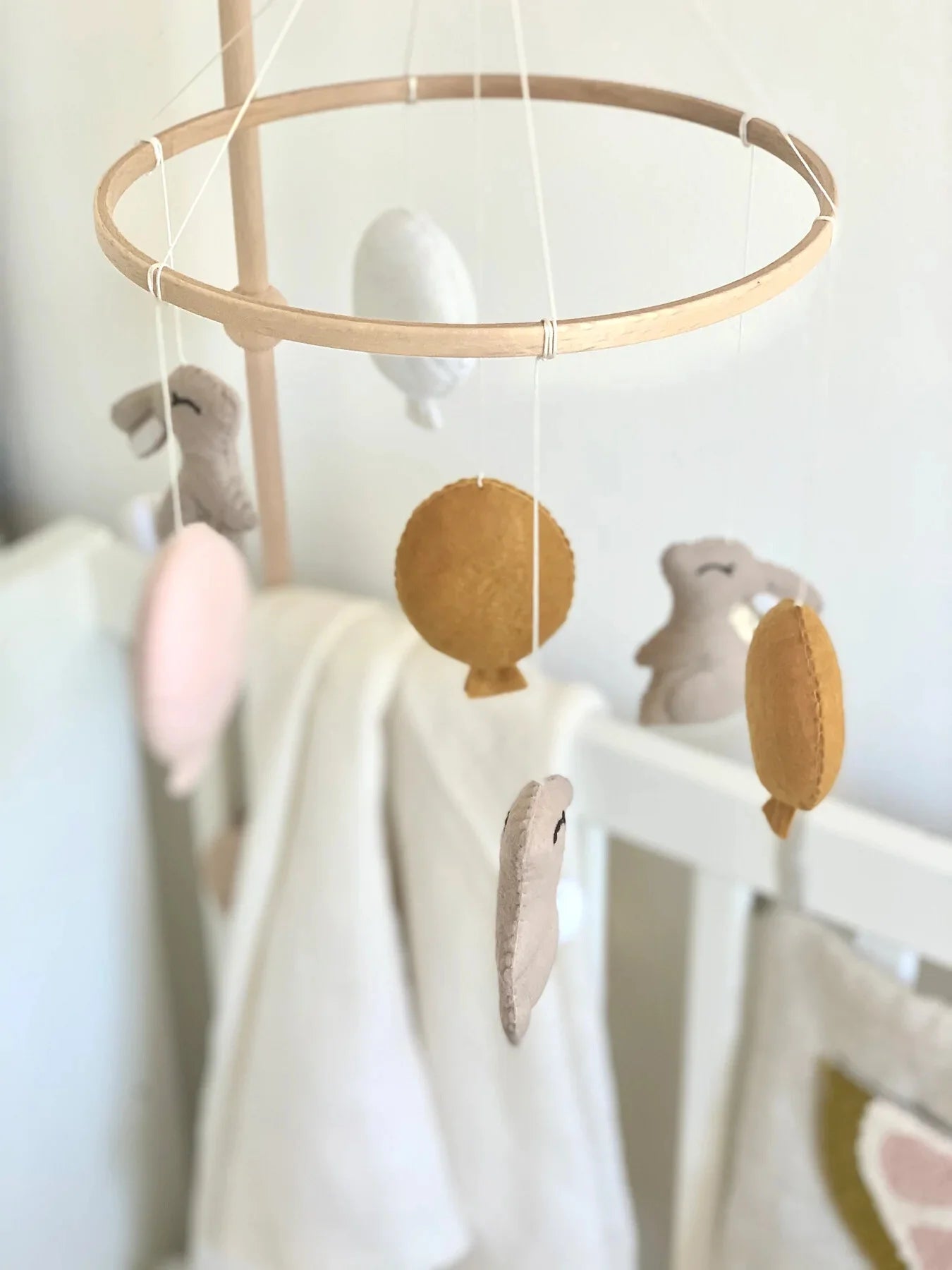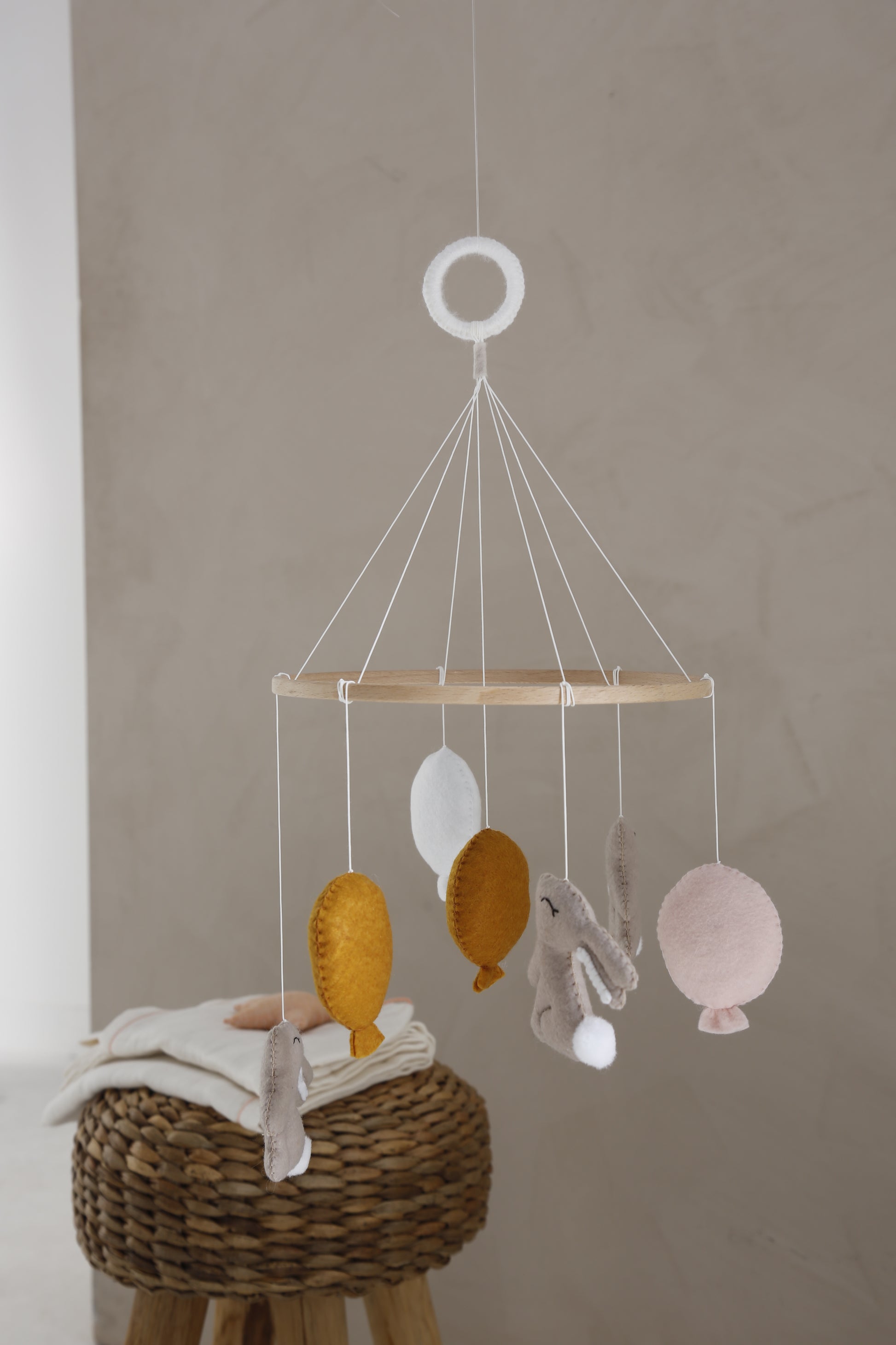 This mobile is super decorative hanging above the crib or changing table. Each product is unique as they are handmade, so they may differ from each other.Note! This is not a toy and is for decoration only. Hang the mobile at a sufficient distance so that children cannot reach it.